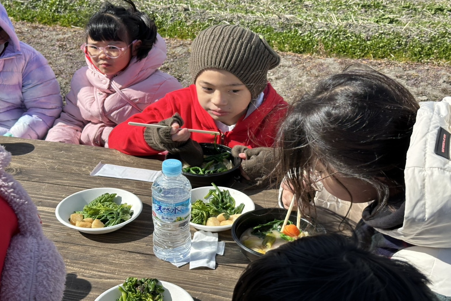 2/19に香港の小学校(中華基督教青年會小學)がBNRファームに来園! ほうれん草と花菜の収穫、さらにコカブの間引きの体験をしていただきました。 収穫した花菜と間引き菜はバターソテー、ほうれん草は豚汁のトッピングとして召し上がっていただきました!